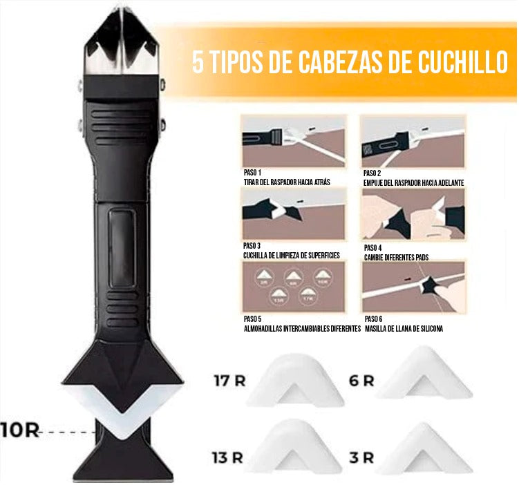 Diseñado para aplicar o quitar masilla. Se puede utilizar como paleta de silicona, raspador de residuos suave o cuchilla afilada.